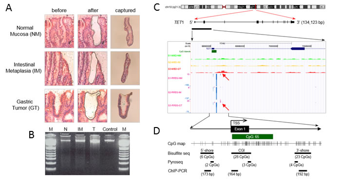 To obtain highly homogeneous cells for methylome analysis, paired specimens of GT tissue and adjacent non-tumor tissue were harvested immediately after surgical resection from a patient with GC and embedded in TissuTek OCT medium (Sakura, Tokyo, Japan) followed by storage at −80°C. The frozen tissues were cut at 8 μm thick, mounted onto membrane slides for photoactivated localization microscopy (PALM) (Zeiss, Munich, Germany), and stained with hematoxylin and eosin. Each specimen was covered with a liquid to improve the optical resolution of tissue sections. LCM was performed using a PALM system (Zeiss). The NM, IM, and GT cells were identified using PALM Robosoftware, and for this purpose cells were placed into 0.5-ml Adhesive-Cap tubes using the PALM system. DNA was extracted using the QIAamp DNA Micro kit (Qiagen, Valencia, CA). After purification, genomic DNA was separated on a 0.8% agarose gel and stained with GelRed (Biotium). The concentration of genomic DNA was quantified using the PicoGreen dsDNA Quantitation kit (Molecular Probes, Eugene, OR).
