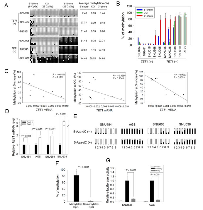 ± 0.95%); SNU668, weakly methylated (29.66 ± 7.71%); AGS and SNU638, heavily methylated (87.01 ± 6.73% and 92.26 ± 2.41%). Quantitative real-time RT-PCR showed that TET1 expression was significantly increased or restored in AGS (P = 0.0056), SNU668 (P < 0.0001), and SNU638 (P < 0.0001) cells after 5-Aza-dC treatment, whereas no difference was observed before and after 5-Aza-dC treatment in SNU-484 cells (P = 0.8828, Figure 4D). Methylation analysis revealed that methylation before 5-Aza-dC treatment was slightly lower at all CpG sites of the cell lines tested compared with after drug treatment (Figure 4E). SNU484, which lacks methylation on the 3′-shore, showed no change in TET1 expression after drug treatment, whereas SNU668, which is weakly methylated in the 3′-shore, showed decreased CpG methylation in the same region and restoration of TET1 expression. These data demonstrated that TET1 expression is relevant to CpG demethylation on the TET1 3′-shore.