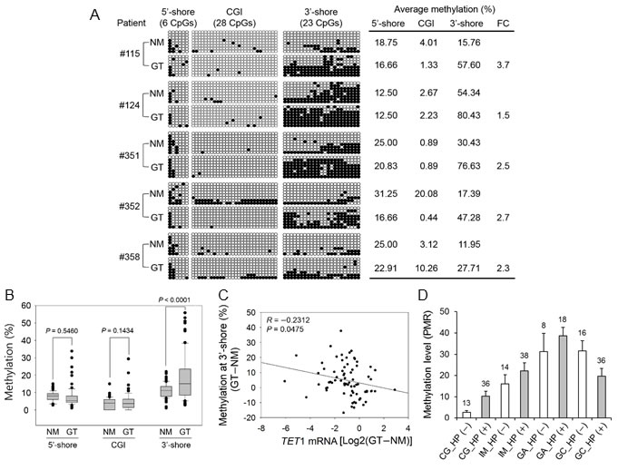 In this study, bisulfite sequencing and pyrosequencing revealed that TET1 downregulation was significantly associated with heavy methylation in the 3′-shore but not the 5′-shore or the CGI in six TET1 (