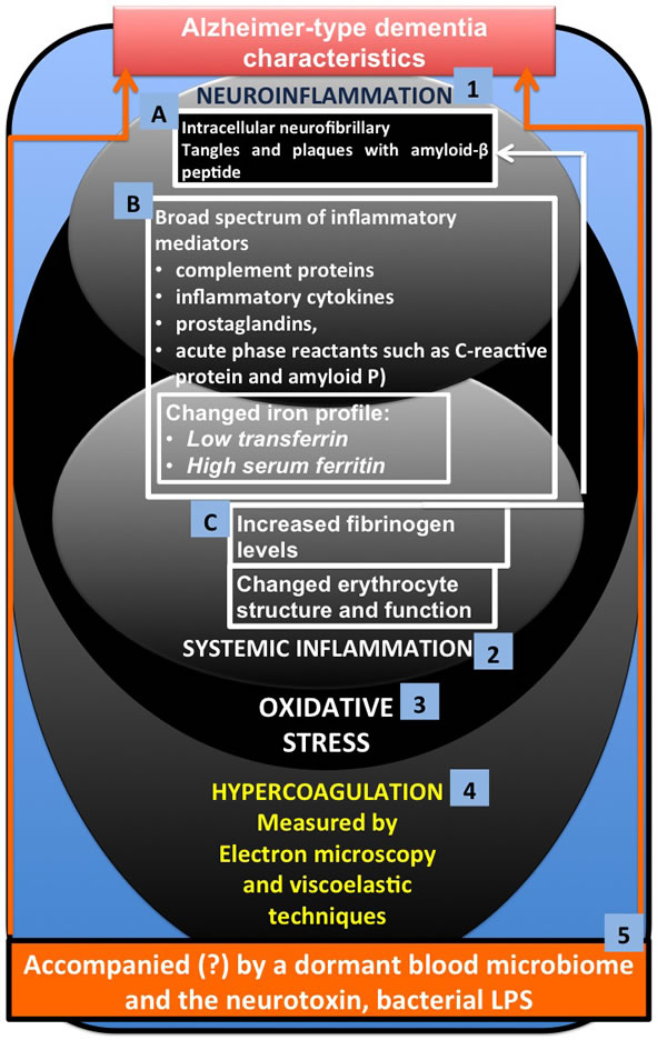 In this paper, we discuss the factors involved in systemic inflammation and show that they are also typically prevalent in neuroinflammation. We focus specifically on literature that shows a changed iron profile, increased fibrinogen levels and oxidative stress; these have each been implicated in a typical hypercoagulable (thrombotic) state, but are also present in AD (the literature is discussed fully in the different sections). Figure 1 shows the layout of this paper, where the focus is on 3 main characteristics of AD, namely (1) neuroinflammation (2) systemic inflammation and (3) oxidative stress. We briefly discuss specific changes in brain morphology (A) and shared inflammatory mediators between neuroinflammation and systemic inflammation (B) (with special reference to a changed iron profile). Factors that are typically implicated in systemic inflammation, but that have an impact on the brain (C) are then examined. We then consider how the three main characteristics are affected by and also result in (4) hypercoagulation and how we can measure this by using electron microscopic and viscoelastic techniques. Lastly, we conclude by discussing possible reasons for this hypercoagulability in AD, and we discuss that the presence of a dormant blood microbiome, and in particular the lipopolysaccharides (LPS) that they can shed, may be central to the hypercoagulable state in this condition [16, 17].