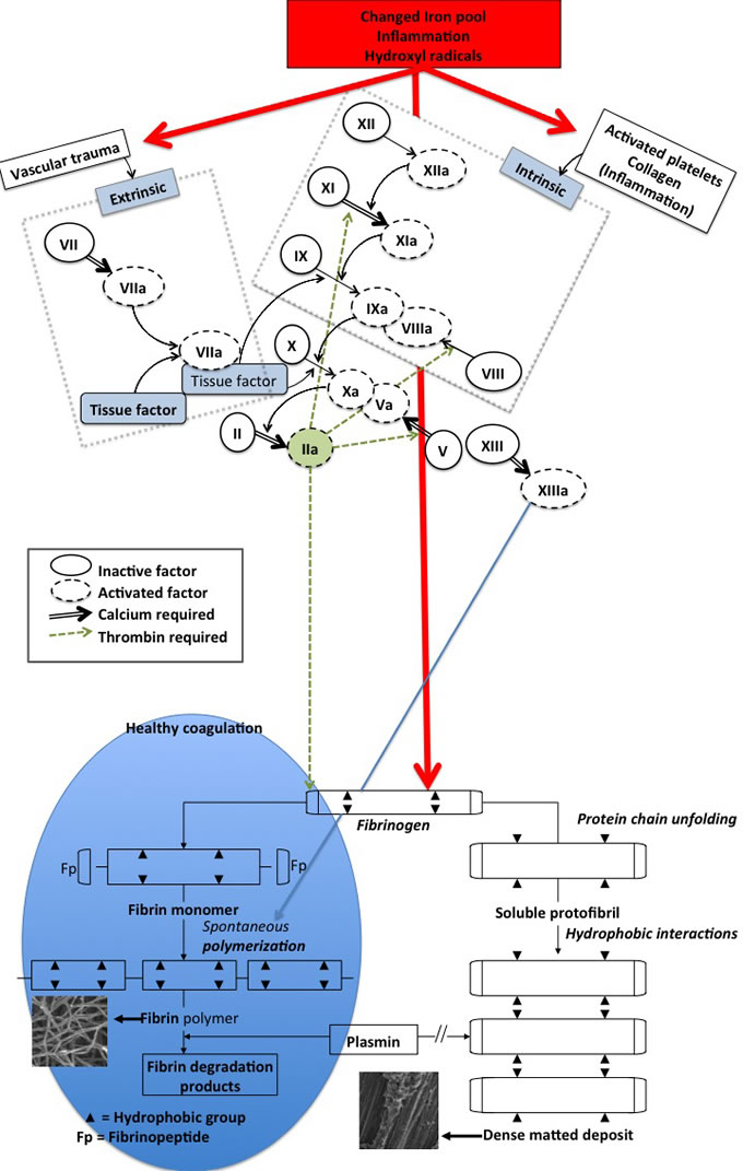 Thrombosis, and therefore hypercoagulation, is typically associated with increased levels of fibrin(ogen) [58, 70, 71]. A changed iron profile (e.g. low transferrin and/or high serum ferritin) is also central to thrombosis and hypercoagulation [38, 58, 72-79] and iron dysregulation is heavily implicated in AD [38, 80]. Changes in fibrin fibre structure (due to hypercoagulation and a changed iron profile) can be visualized using various ultramicroscopy techniques [54, 58, 81-86]. In addition, these changes might be correlated with results from viscoelastic techniques like thromboelastography (TEG®) [52, 79, 85, 87, 88]. Figure 2 shows how the intrinsic and extrinsic coagulation process causes fibrin fibre formation under normal conditions, and how fibrin fibre formation is changed under the influence of a changed (aberrant) iron profile, whether by generating hydroxyl radicals (resulting in oxidative stress, and also during systemic inflammation) [89] or by electrostatic means [57, 58].