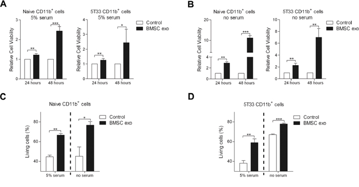 Figure 3: BMSC exosomes induce CD11b+ cell survival. CD11b+ cells isolated from naive BM (naive CD11b+ cells, n = 3) or 5T33MM BM (5T33 CD11b+ cells, n = 3) were cultured with BMSC exosomes (BMSC exo, 100 μg/ml) in A. 5% serum or B. serum free (no serum) conditions for 24 or 48 hours, and the cell viability was determined by a luminescent viability assay. C. Naive (n = 3) or D. 5T33 CD11b+ cells (n = 3) were cultured with BMSC exosomes (100 μg/ml) in 5% serum medium for 48 hours or in serum free condition for 24 hours, and the living (Annexin V-) cells were determined by flow cytometry. * = p < 0.05, ** = p < 0.01, *** = p < 0.001.