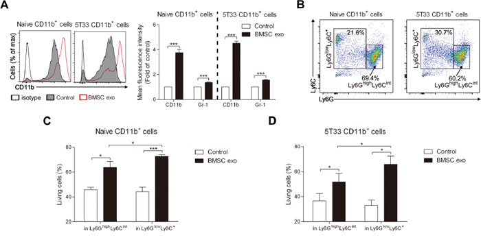 Figure 4: BMSC exosomes mainly induce the survival of CD11b+ Ly6GlowLy6C+ cells. A. Naive (n = 3) or 5T33 CD11b+ cells (n = 3) were cultured with BMSC exosomes (BMSC exo, 100 μg/ml) in 5% serum medium for 48 hours and then stained with anti-CD11b-PE-Cy7 and anti-Gr-1-APC. Mean fluorescence intensities of CD11b and Gr-1 were measured by flow cytometry. B. Subpopulations of naive or 5T33 CD11b+ cells were determined using anti-Ly6G-PE-Cy7 and anti-Ly6C-APC staining. C. Naive (n = 3) or D. 5T33 CD11b+ cells (n = 3) were treated with BMSC exosomes (100 μg/ml) in 5% serum medium for 48 hours and then stained with anti-Ly6G-PE-Cy7, anti-Ly6C-APC, and Annexin V-FITC. The percentages of living (Annexin-V-) cells in Ly6GlowLy6C+ and Ly6GhighLy6Cint subsets were determined by flow cytometry. * = p < 0.05, *** = p < 0.001.