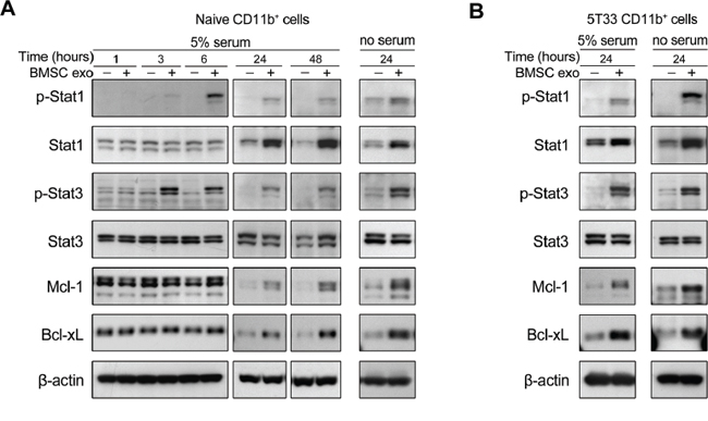 Figure 5: BMSC exosomes activate STAT1 and STAT3 pathways and increase Bcl-xL and Mcl-1 in CD11b+ cells. A. Naive CD11b+ cells were cultured with BMSC exosomes (BMSC exo, 100 μg/ml) in 5% serum or serum free (no serum) condition for indicated hours. The total and phosphorylated Stat1 and Stat3, as well as the expression of Bcl-xL and Mcl-1 were detected using western blot. The analysis of β-actin protein was included as a loading control. B. 5T33 CD11b+ cells were cultured with BMSC exosomes (100 μg/ml) in 5% serum or serum free condition for 24 hours. The total and phosphorylated Stat1 and Stat3, as well as Bcl-xL and Mcl-1 were detected using western blot.