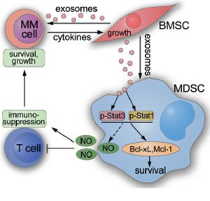 In conclusion, BMSC exosomes not only directly promote MM survival but also indirectly favor MM progression through enhancing the immunosuppressive activity of MDSC in the BM. Our findings not only address the role of BMSC exosomes in the BM microenvironment but also expand the understanding of the participation of these exosomes in MM progression. Moreover, our results strengthen the usefulness of STAT inhibitors in MM treatment through targeting of MDSC activation.