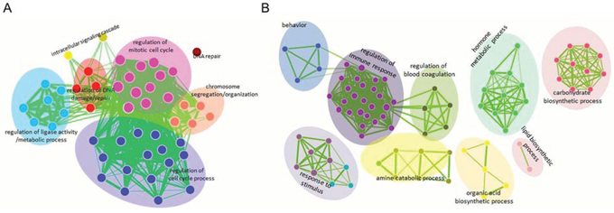 Figure 1: Functional enrichment maps of deregulated protein-coding genes in HCC. The gene sets for GO terms were visualized using the Cytoscape Enrichment Map plugin. Each node represents a GO term. Node size is indicative of the number of genes in a set. The thickness of each line is indicative of the number of genes shared between the connected gene sets. The enriched gene sets of up-regulated protein-coding genes in HCC are shown in A. and the down-regulated protein-coding genes in HCC are shown in B.