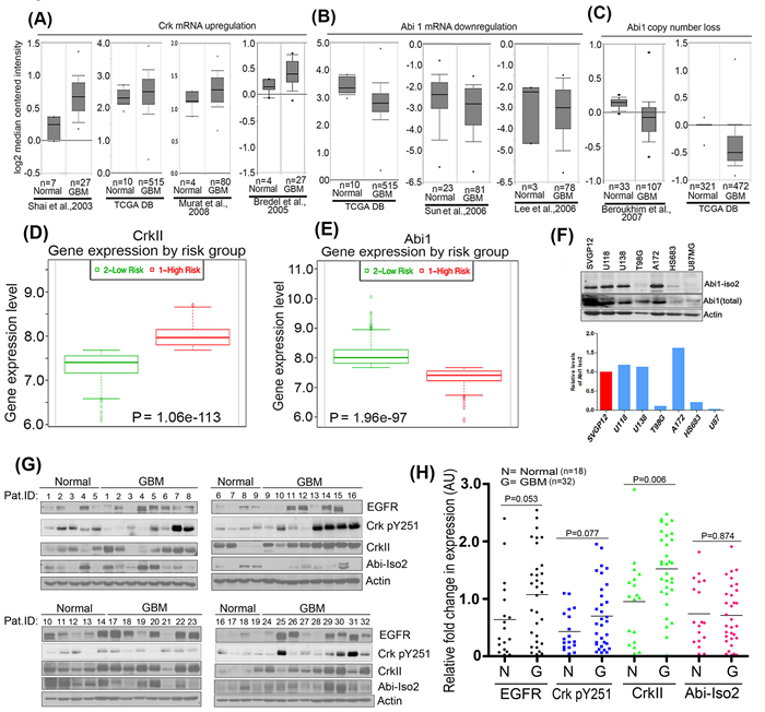Bioinformatics meta-analysis for genomic and gene expression changes were performed on next-generation sequencing data from multiple studies made available through CBioportal for Cancer Genomics and Oncomine databases. Results were represented as on a log2 scale as Box- Whisker plots. P value of less than 0.003 was considered significant. The gene expression data of CrkII and Abi1-Iso2 were used to classify human GBM cases into high and low groups by SurvExpress analysis. Gene Set Enrichment Analysis (GSEA) was performed on the Broad Institute GenePattern Server using 75th-percentile normalized RSEM gene expression values downloaded from the NCI Data Matrix Portal. Cases of coupled or uncoupled ABI1 and CRK expression were selected based on the normalized expression of these genes relative to the remainder of the dataset.