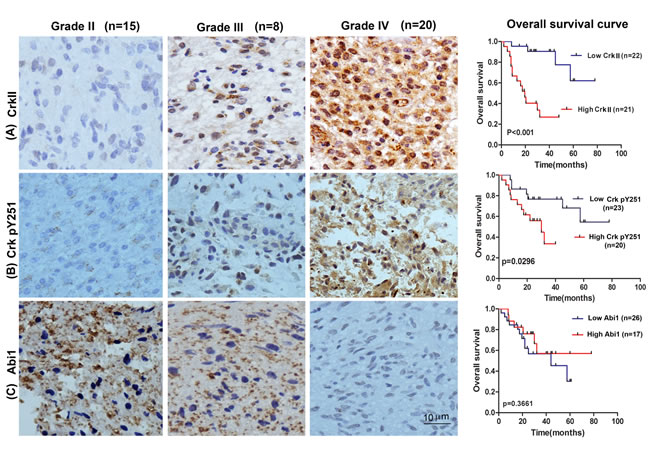 The prognostic value of Crk, Crk phosphoY251 and Abi1 for overall survival in glioma cancer patients was evaluated by comparing the patients with high and low Crk, Crk pY251 and Abi1 expression. According to Kaplan-Meier survival analysis, patients with high Crk and Crk phosphoY251 expression had distinctly lower overall survival rates than those with low Crk and Crk phosphoY251 expression (Figure 2A-2B right panels, p < 0.001 and p = 0.0296 respectively). By contrast, although low expression of Abi1-Iso2 appeared to have lower overall survival, this could not reach statistical significance (Figure 2C right panel, p = 0.366). H&E staining were performed on all the specimens to assess the tumor grades (Supplementary Figure S1).