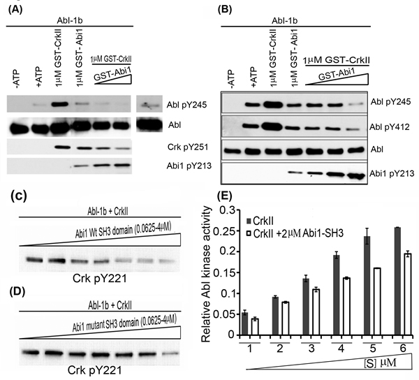 10nM Abl 1a was incubated with a 100-1000 fold molar excess of GST, GST-CrkII or GST-Abi1 isoform2 proteins in kinase buffer (50mM Tris-Cl, 3mM DTT and 10mM MgCl2). The reaction mixtures were kept on ice with intermittent mixing for 1hr. 0.1mM ATP was added to the individual reaction mix and incubated in at 25oC for 10min. The reactions were terminated by addition of SDS sample buffer and analyzed by immunoblotting.