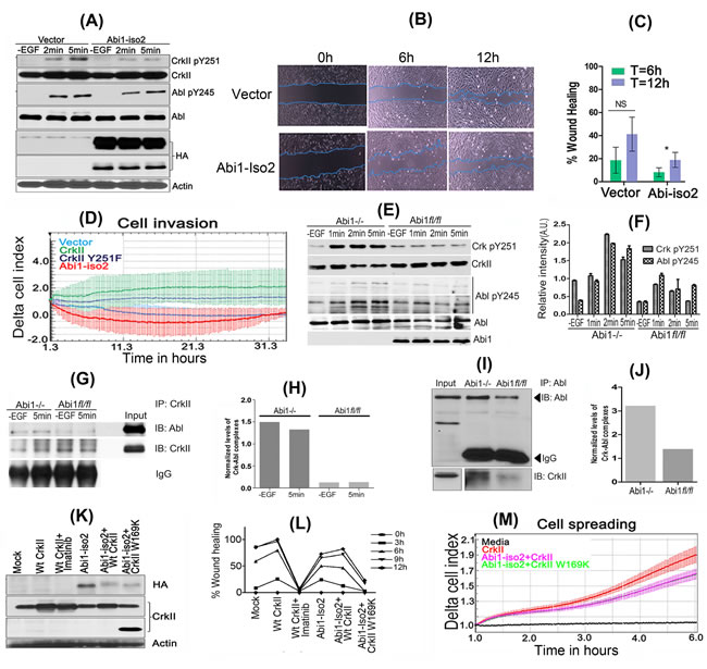 Figure 5: Reciprocal role of Abi1-Iso2 in Crk-mediated Abl transactivation and in Crk-Abl1b axis-mediated cell motility and invasion. A. HS683 stable cell line overexpressing Abi1-Iso2 shows significant reduction in Crk Y251 and Abl Y245 phosphorylation in time dependent manner. B. Wound-healing assay: Cell migration of HS683 stable cells was assessed by imaging the rate of wound healing by serum starved, hEGF stimulated cells in triplicate at 6 and 12hrs time-points. C. Percentage wound healing was calculated and represented in the bar graph (n = 3) (P < 0.05). D. Real-time xCELLigence assay for cell invasion: Cells were grown to 80% confluency, serum starved and seeded in triplicates in matrigel coated upper chambers of CIM plates. 10% FBS containing media was used as chemoattractant in the lower chamber of CIM plate. Change in Cell index was measured every 15min for 36-48 hours. E. Abi1-/- and Abi1 fl/fl MEFs were serum-starved overnight and stimulated with 100ng/ml of hEGF. Enhanced CrkY251 and AblY245 phosphorylation was observed in Abi1-/- MEFs as compared with Abi1 fl/fl cells. F. Densitometry of phosphoprotein bands were calculated, normalized by ImageJ and represented in bar graphs. G.-H. Crk and Abl kinase complexes that form with or without EGF treatment in Abi1-/- MEFs were investigated by immunoprecipitation of Crk after diluent or hEGF stimulation. I.-J. Reverse immunoprecipitation by Abl antibody and immunoblotting with Crk antibody was performed. K.-L. Wound healing/scratch assay: Abi1-/- MEFs, were transiently transfected as indicated. 48hrs post-transfection, cells were serum starved for 16hrs and assayed for wound healing as described (see methods). M. Microimpedance-based cell spreading assay: 10,000 cells transfected as described in panel K were seeded on fibronectin coated E-plate 16 and assessed by real-time cell spreading assay every minute by xCELLigence RTCA DP. Data are represented as mean ± SEM, and n = 3 for Panel C and F. See also Supplementary Figure S6.