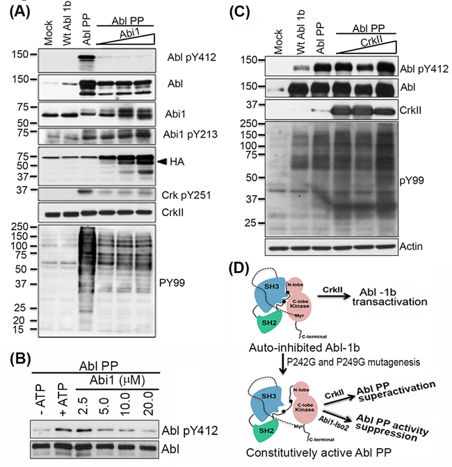 Figure 6: Abi1-Iso2 can bind to open conformation of Abl kinase to suppress its activity in vivo. A. HEK293T cells were transfected with plasmids encoding WtAbl-1b or constitutively active, partially open conformation Abl PP alone or co-transfected with increasing amount of Abi1-Iso2 plasmid DNA. Abl PP constitutive activity is downregulated to markedly low levels (Abl pY412 blot) that correlates with Abi1-Iso2 expression level (HA blot) in cells. Abi1 Y213 phosphorylation increases with increasing amount of Abi1 in these cells. Endogenous Crk Y251 phosphorylation and general phosphotyrosine levels (PY99) that are mediated by Abl PP are downregulated by Abi1-Iso2. B. Crk co-transfected with Abl PP in the similar experimental design superactivates Abl PP as indicated by PY99 blot. C. In vitro kinase assay using Abl PP and Abi1-Iso2: Abl PP was co-incubated with Abi1-Iso2 in kinase buffer for 30min, reactions were boiled and immunoblotted for Abl pY412. D. Schematic representation of effect of Crk and Abi1-Iso2 on differential regulation of Abl PP activity.