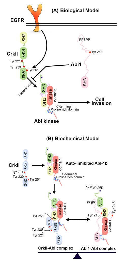 Recently, we described a non-canonical pathway for Crk signaling whereby Tyr221 phosphorylation, rather than turning off Crk signaling, redirects signaling from the conventional SH2->SH3(N) circuitry to an unconventional SH3(N)->pSH3(C) circuitry, mediated by iterative tyrosine phosphorylation of Crk on Tyr221 and Tyr251 or Tyr239 [13]. Using bioinformatics, high throughput SH2 profiling, and co-immunoprecipitation we showed that Tyr239 and Tyr251, when phosphorylated, interact with C-terminal Src kinase (CSK) and Abl respectively, providing a link between Crk phosphorylation and the activation of non-receptor tyrosine kinases known to impinge on Crk biology [13]. In the case for Abl kinase, which induces non-canonical signaling by binding to Crk and promoting iterative phosphorylation on Tyr221, Tyr239, and Tyr251, the pTyr251 motif binds the Abl SH2 domain and induces Abl transactivation prior to the dissociation of Crk from Abl [13] .