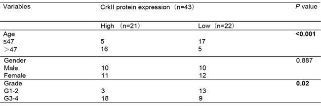 Table 1: Association between CrkII expression and clinicopathological factors of glioma patients