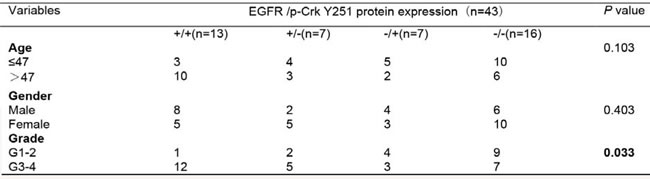 Table 3: Association between EGFR and Phospho-Crk Y251 expression and clinicopathological factors of glioma patients