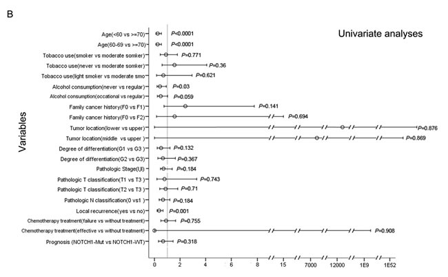 We further validated our results in an extended ESCC cohort (cohort #2). A total of 89 ESCC patients from Shanxi and Henan provinces, Taihang Mountains received standard chemotherapy (NCCN guidelines) and were randomly assigned to cohort #2 (Supplementary Table 1-2). The genotype of NOTCH1 and PIK3CA was analyzed in 89 formalin-fixed paraffin-embedded tumors by PCR-Sanger sequencing using the paired primers 1F (ACCCGATGCGGTTAGAGCC), 1R (ACACAATAGTGTCTGTGACTCC), 2F (ACTCCATGCTTAGAGTTGGAG), and 2R (GGATTGTGCAATTCCTATGCAATC) for PIK3CA and 1F (GTGACTGCTCCCTCAACTTCAAT), 1R (CTGTCACAGTGGCCGTCACT), 2F (GTCAACGCCGTAGATGACCT), and 2R (TCTCCTCCCTGTTGTTCTGC) for NOTCH1. Moreover, we validated our result in another three independent ESCC mutation datasets: Cohort #3 from our previous report of 17 WGS and 71 WES samples, which was recruited from the Chaoshan District of Guangdong Province, another area that has high ESCC prevalence in China [7]. Cohort #4 was from Lin et al. of 20 WES and 119 TCS samples, which were recruited from CICAMS and Linxian Cancer Hospital [8]. Cohort #5 from Gao et al. contained 113 WES samples, which were recruited from CICAMS [9].