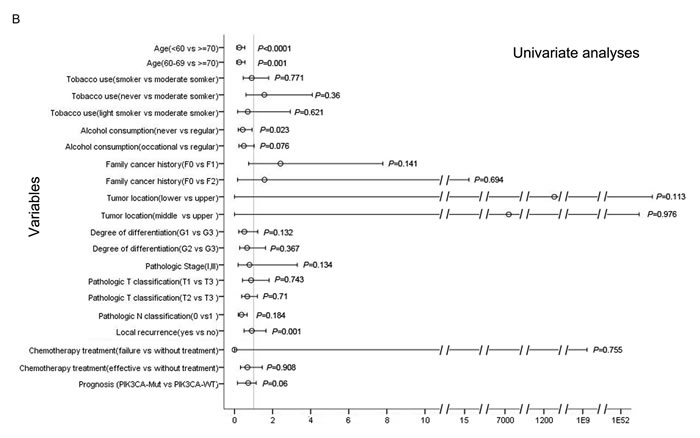 The OS and progression-free survival (PFS) distributions were described by the Kaplan-Meier curves, and statistical significance was calculated using the log-rank test. OS was evaluated from the time of diagnosis to death or the final follow-up. Censored cases were defined as patients who lost contact during the follow-up and who were still alive at the end of the study. PFS was evaluated from the time of diagnosis to the occurrence of cancer-related death or emergence of recurrent tumors or the last follow-up. Censored cases were defined as patients who were still alive and had no recurrent tumors at the end of the study. The primary outcome was clinical benefit, which was defined as failure or response to chemotherapy. The occurrence of cancer-related death or the emergence of recurrent tumors in patients who had received standard chemotherapy was considered to represent failure of chemotherapy. Univariate and multivariate analyses with the Cox proportional hazards model were used to examine the association between mutations and overall survival and response to chemotherapy. For multivariate analysis, in addition to the confounders with univariate P values of < 0.05, traditional prognostic factors, including age, smoking, drinking, clinical stage, tumor differentiation, and chemotherapy treatment, were adjusted for the analysis of the prognosis.