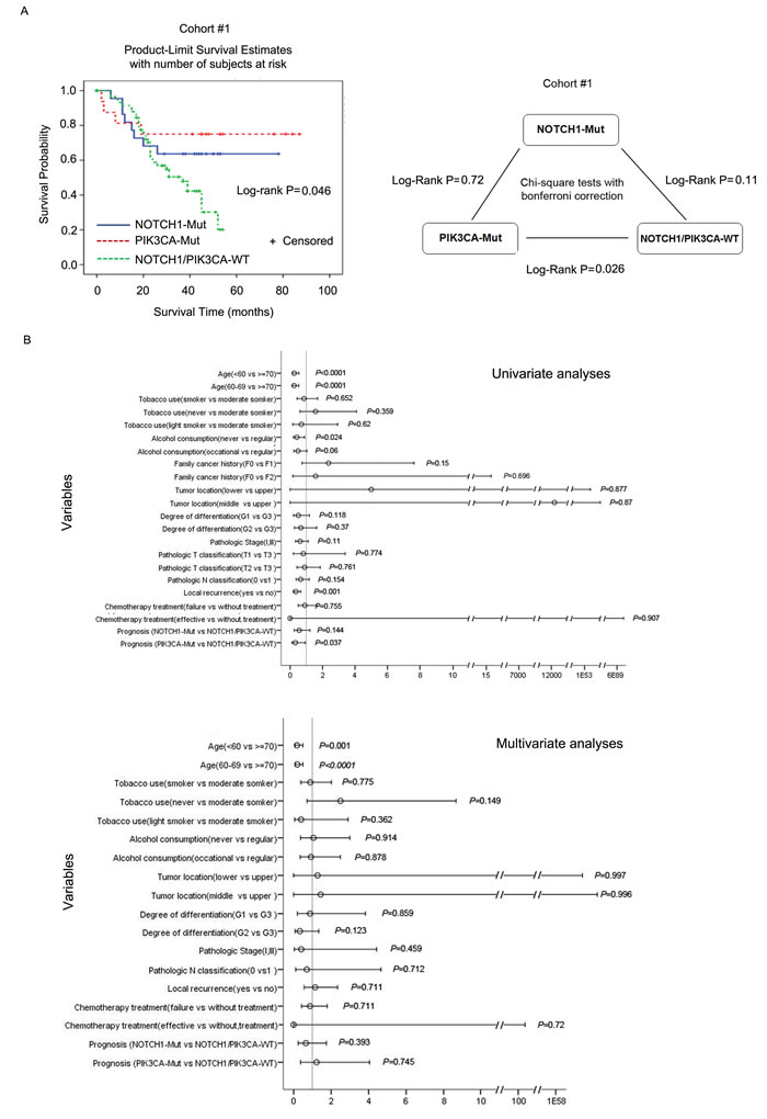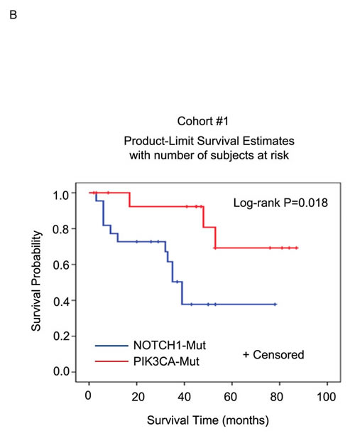 In this study, we describe the identification and validation of mutually exclusive mutational patterns of NOTCH1 and PIK3CA, two significantly mutated genes (SMGs) identified in ESCC via genomic analyses [7-10], and their associations with clinical variables.