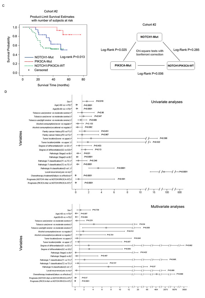 Figure 4: Overall survival among cohorts #1 and #2 according to NOTCH1 and PIK3CA mutation status. (A and C) Left panel: Kaplan-Meier survival curves for three groups of patients defined by NOTCH1 and PIK3CA mutations in cohort #1 A. or cohort #2 C.. The log-rank test was used to calculate the significance. Right panel: chi-square test with Bonferroni correction was used to analyze the OS for the patients in the subgroups. (B and D) Cox regression analysis was used to adjust for traditional prognostic factors in cohort #1 B. and cohort #2 D..