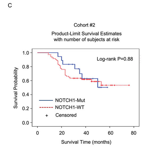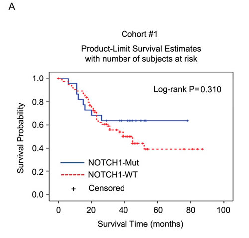 Figure 2: Overall survival among cohorts #1 and #2 according to NOTCH1 mutation status. Kaplan-Meier survival curves for patients with NOTCH1 mutations or wild-type in cohort #1 A. and cohort #2 C.. The P values were computed by log-rank test. Cox regression analyses were used to adjust for traditional prognostic factors in cohort #1 B. and cohort #2 D..