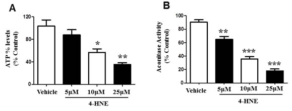 Figure 3: 4-HNE reduces SAEC ATP% levels and aconitase activity. Cultured SAECs were treated with 5, 10, and 25 μM of 4-HNE and compared to vehicle controls. A. Percent ATP levels were determined by lucerifase assay and detection of light production by a luminometer. B. Mitochondrial dysfunction was assessed by Aconitase assay. Aconitase activity was determined by measuring NADPH production from conversion of μU of citrate to isocitrate per minute per mg of mitochondrial protein, with absorbance measured at 340 nm. Values are expressed as percent of control. Data is reported as means ± SEM. *p-value < 0.05 vs. control, **p-value < 0.01 vs. control, ***p-value < 0.0001 vs. control.