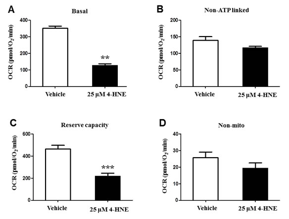Figure 4: Bioenergetic and oxygen consumption evaluation of SAEC mitochondria. SAECs were treated with 25 µM 4-HNE and compared to vehicle controls. A. Basal, B. non-ATP linked, C. reserve capacity, and D. non-mitochondrial OCR (pmol/O2/min) were measured in SAECs by XF analysis. After basal OCR was measured, oligomycin (1μg/ml), FCCP (1μM), and antimycin A (10 μM) were injected consecutively through Seahorse Flux Pak cartridges, with resulting OCR measured after each injection. Data is reported as means ± SEM. **p-value < 0.01 vs. control, ***p-value < 0.001 vs. control.