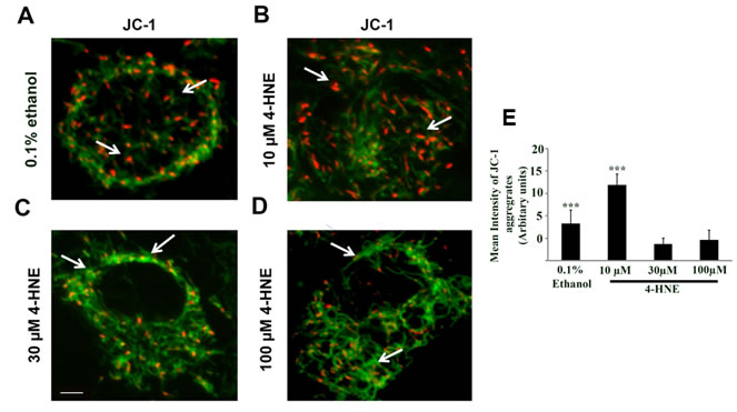 Figure 5: Assessment of mitochondrial dysfunction by JC-1 staining of 4-HNE treated SAECs. SAECs were plated at a density of 2 X 105 cells/ml in a 12 mm Nunc glass bottom dish and treated with various concentration of 4-HNE (10-100 μM) or vehicle at 37oC for 15 min. The medium was replaced and cells were incubated with JC-1 probe (10 µg/ml) at 37oC for 15 min, washed and live imaging was performed using confocal microscope. A. = Vehicle (0.1% ethanol). B.-D. = 10, 30 and 100 µM 4-HNE. In vehicle and 10 µM 4-HNE treated sample, predominantly orange-red fluorescence is seen in the mitochondria (arrows in A. and B.), whereas with 30 and 100 µM 4-HNE treatment, mitochondria showed higher green fluorescent signal relative to vehicle or 10 µM 4-HNE (arrows in C. and D.). E. The JC-1 aggregates were quantified using Image J software and the mean intensity is expressed as Arbitrary Units. ***p < 0.001 Vehicle (0.1% Ethanol) vs. 4-HNE (30 and 100 µM), ***p < 0.001 10 µM 4-HNE and 30 and 100 µM 4-HNE, respectively. Scale bar = 10 µm, Magnification = 60X.