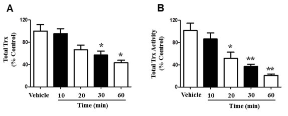 Trx activity was determined enzymatically in cultured cells, according to methods described elsewhere [47, 48], including TrxR activity for comparison. 100 μl of 10.1% Triton X-100/PBS was used to induce cell lysis and a 5 μl aliquot was analyzed for protein concentration using BioRad protein assay (Hercules, CA), with bovine serum albumin (BSA) included as the standard. Protein was combined with 137 μl of reaction mixture [0.1 M Tris-HCl (pH 7.5), 2 mM EDTA, 0.2 mM NADPH, and 75 nM rat TR]. Insulin-reducing assay was used, according to methods previously described, to determine Trx activity [48]. The reaction was evaluated by spectrophotometric analysis, recording the decrease in absorbance at 340 nm each 30 seconds in a 5 minute time span, to monitor the oxidation of NADPH. The control samples were subjected to the same treatment, except in the absence of insulin. ΔA340 of control samples were subtracted from the ΔA340 of each experimental sample. Calculated values were plotted on a standard curve to determine the absolute amounts of Trx in the cell extract.