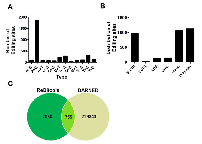 We used the REDItools software package to create tables of every potential RNA editing position (http://150.145.82.212/ernesto/reditools/doc/) [28]. We required: minimum depth of coverage 10X in DNA and RNA, no variant alleles in the DNA sequencing, at least 2 alternate alleles and at least 10% alternate alleles in RNA sequencing based on previous publication [23]. These criteria led to extraction of RNA editing sites that overlapped across all 3 samples with the same substitution. Annotation of each editing sites in the selected files was achieved by using the Human RefSeq database. Confidence filtering for edited sites was achieved by using stringent conditions such as 20% alternate RNA allele frequency and 20x RNA coverage. Feature and Gene based counting of edited site in the genomic locations such as intron, exon, CDS, 3’ UTR, 5’ UTR, or unknown sites were identified based on RefSeq annotations [39].