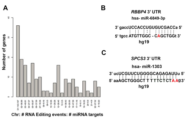 Figure 3: Identification of RNA editing in miRNA target binding sites in the 3’ UTR of genes. A. Genes containing A-to-G edited miRNA targets for all chromosomes are shown. On the x-axis, the chromosome number, total number of editing events, and total number of miRNA targets associated with it are listed. On the y-axis, the number of genes associated with editing events in the miRNA binding sites is depicted. B.-C. Validation of editing in potential miRNA binding sites by in silico analysis for Rbbp4 B. and Spcs3 C. The images show miRNA target sites and the complementary hg19 sequence. The edited site in the seed sequence of the mature miRNA is highlighted in bold. The hsa-miR-6849-3p binding site was located in Rbbp4 3’ UTR at chr1:33,149,343-586. The bold position is an A-to-G RNA-editing event located at chr1:33,149,443 in Rbbp4 (B). Similarly the hsa-miR-1303 binding site is located in Spcs3 3’ UTR at chr4:177,252,226-427. The bold positions are two A-to-G edited sites located at chr4:177,252,326 and 327 (C)..