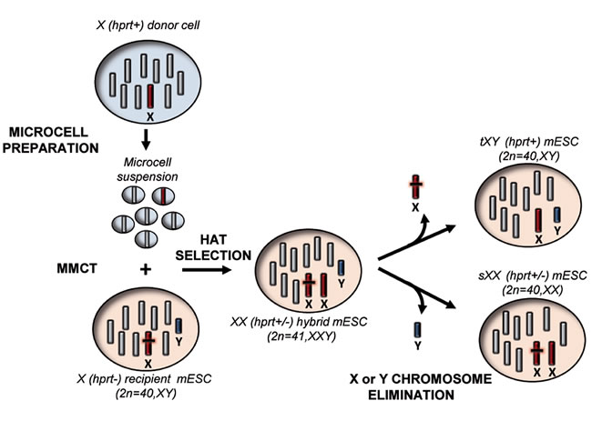 Figure 1: Schematic overview of the “genomic therapy” approach. The scheme shows the step by step procedure followed to generate mouse ESCs in which an endogenous chromosome is replaced with an exogenous one. Hprt: Hypoxanthine phosphoribosyltransferase, MMCT: Microcell mediated chromosome transfer, HAT medium: hypoxanthine-aminopterin-thymidine medium, tXY: transplanted XY mouse ESCs, sXX: substituted XX mouse ESCs.