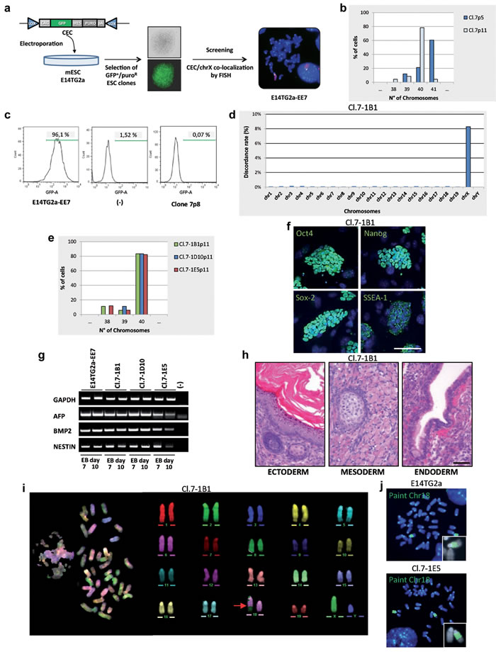 Figure 2: Isolation and characterization of the tXY clones. a. Schematic diagram showing the isolation of E14TG2a clones carrying the CEC plasmid on the X chromosome. Whole X chromosome painting (red) and CEC vector (green) were used as probes in metaphase FISH. CEC, chromosome elimination cassette vector: puro, puromycine. b. Chromosome number distribution (n = 30 each). c. Flow cytometry analysis of GFP expression. d. Chromosome distribution of the SNP diversity. Cl.7-1B1 is compared to the E14TG2a parental cell line. e. Chromosome number distribution of the 3 subclones (n = 30 each). f. Immunostaining for stemness markers (green). Scale bar, 100 µm. g. mRNA expression analysis of the differentiation markers on day 7 and 10 embryoid bodies (EB day 7 and EB day 10) by RT-PCR. GAPDH is used as control. h. Teratoma formation assay. H&E stainings show keratinized stratified squamous epithelium (ectoderm), skeletal muscle and focus of early cartilaginous differentiation (mesoderm), columnar ciliated epithelium with goblet cells (endoderm). Scale bar, 50 µm. i. M-FISH metaphase spread and corresponding pseudo-colored karyotype. The red arrow indicates the rearrangement. j. Metaphases FISH; whole mouse chromosome 18 painting (green) was used as probe. All passage numbers are indicated with p.