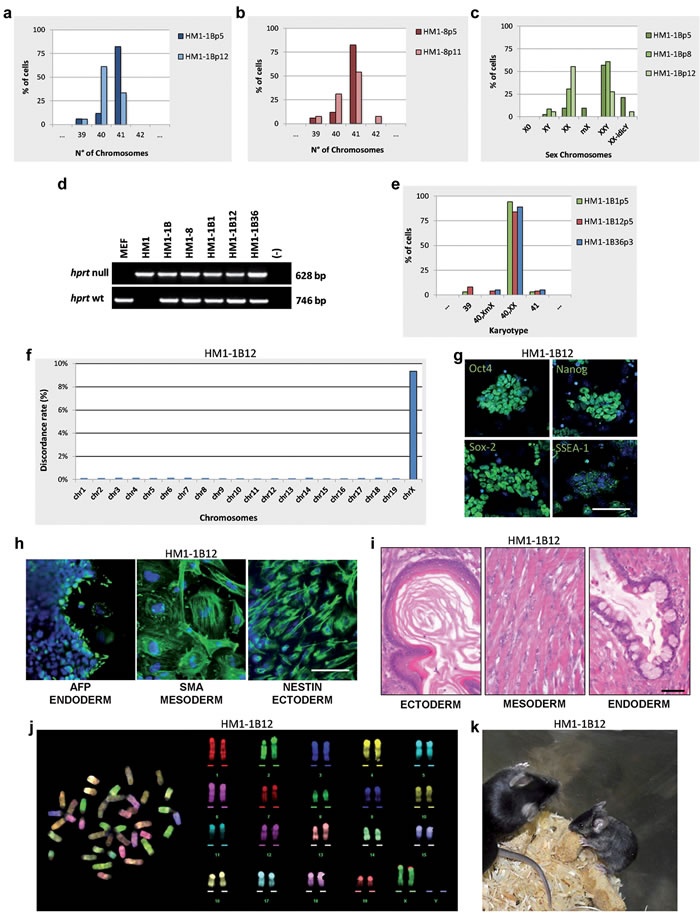 The selected sXX subclones were also analyzed for markers of pluripotency and differentiation capacity. Real-Time PCR expression analysis (data not shown), immunofluorescence analysis of stemness genes, in vitro differentiation into the three germ layers and teratoma formation suggested that the three subclones maintained the original pluripotency. The analyses performed on the HM1-1B12 clone are shown in Figure 3g-3i. The karyotypically normal HM1-1B12 (Figure 3j) and HM1-1B36 subclones were used for further experiments in vivo, after having assessed the efficiency of the HM1 cell line in generating chimeras and in germline colonization. By blastocyst injections we obtained 3 fertile chimeras for both clones: 2 males and 1 female for HM1-1B12 and 1 male and 2 females for HM1-1B36, respectively. However, all the females were low-grade chimeras and the one derived from HM1-1B12 (Figure 3k) appeared smaller than normal. Chimeric females were fertile but none of them gave rise to offsprings deriving from the sXX subclones. XX cells in male blastocysts cannot form gametes.
