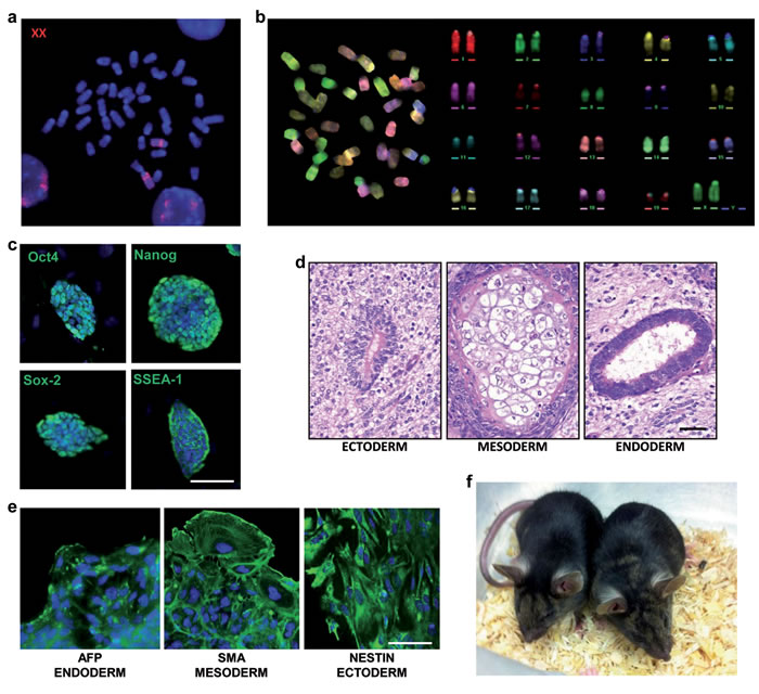 Figure 4: Characterization of the NT-E3.2 rejuvenated clone. a. FISH metaphase spread. Whole mouse X chromosome painting (red) was used as probe. b. M-FISH metaphase spread and corresponding pseudo-colored karyotype. c. Immunostaining for stemness markers (green). Scale bar, 100 µm. d. Teratoma formation assay. H&E stainings show mature nervous tissue surrounding a rosette of primitive neuroepithelium (ectoderm), cartilage (mesoderm), a glandular structure lined by a columnar ciliated epithelium (endoderm), Scale bar, 50 µm. e. Immunostaining for embryoid bodies (green), scale bar, 50 µm. f. Chimaeric mice generated by an NT-clone.