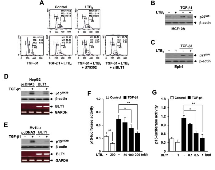 Figure 1: LTB4/BLT1 axis inhibits TGF-β1-induced G1 arrest and expression of p27KIP1 and p15INK4B. A. Upper panels: MCF10A cells were incubated with or without 5 ng/ml of TGF-β1 for 24 h in the absence or presence of 100 nM of LTB4. Lower panels: MCF10A cells pretreated with 10 µM of U75302 or transfected with BLT1 siRNA were incubated with or without 5 ng/ml of TGF-µ1 for 24 h in the absence or presence of 100 nM of LTB4. Cells were then stained with propodium iodide and subjected to FACS analysis. The percentage of cells in G1 was designated as M1, S as M2, and G2/M as M3. B. MCF10A and C. Eph4 cells were pretreated with EtOH (vehicle) or 100 nM of LTB4 for 30 min and then stimulated with 5 ng/ml of TGF-β1 for 24 h. The cell lysates were analyzed by immunoblot for p27KIP1 level. Stable D. HepG2 and E. Mv1Lu cell lines that expressing the control vector (pcDNA3) or BLT1 were stimulated with 5 ng/ml of TGF-β1 for 24 h. The cell lysates were analyzed by immunoblot for p27KIP1protein level and by semiquantitative RT-PCR for BLT1 mRNA level. β-actin and GAPDH levels were monitored as controls. F. HepG2 cells transfected with p15INK4B-luciferase reporter plasmid were pretreated with LTB4 at the indicated concentrations for 30 min and then stimulated with 5 ng/ml of TGF-β1 for 24 h. G. HepG2 cells co-transfected with p15INK4B-luciferase reporter plasmid together with the indicated amount of BLT1 plasmid were stimulated with 5 ng/ml of TGF-β1 for 24 h. Luciferase activities were normalized on the basis of β-galactosidase expression to adjust for variation in transfection efficiency. All quantitative data are shown as the mean ± SD of three independent experiments. *p < 0.05, **p < 0.01.
