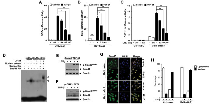 Figure 2: LTB4/BLT1 axis inhibits TGF-β1-induced Smad3 transactivation without affecting Smad3 C-terminal phosphorylation and its translocation into the nucleus. A. HepG2 cells transfected with Smad-binding element (SBE)-luciferase reporter plasmid were pretreated with LTB4 at the indicated concentrations for 30 min and then stimulated with 5 ng/ml of TGF-β1 for 24 h. B. HepG2 cells co-transfected with SBE-luciferase reporter plasmid together with the indicated amounts of BLT1 plasmid were incubated with or without 5 ng/ml of TGF-β1 for 24 h. C. HepG2 cells co-transfected with G5E1b-luciferase plasmid together with Gal4-DBD or Gal4-Smad3 plasmid were pretreated with LTB4 at the indicated concentrations for 30 min and then stimulated with 5 ng/ml of TGF-β1 for 24 h. Luciferase activities were normalized as in Fig. 1 F. and G.. All quantitative data are shown as the mean ± SD of three independent experiments. *p < 0.05, **p < 0.01. D. Stable Mv1Lu-pcDNA3 and Mv1Lu-BLT1 cell lines were incubated without or with 5 ng/ml of TGF-β1 for 2 h, and nuclear extracts were subjected to gel shift assay using probe containing four copies of SBE. Black arrow indicates the position of the Smad3-DNA complex. The supershifted band (white arrow) was observed upon addition of the Smad3 antibody to the binding reaction. E. MCF10A cells pretreated with EtOH (vehicle) or 100 nM of LTB4 for 30 min were stimulated with 5 ng/ml of TGF-β1 for 30 min. The protein levels of Smad3 and its phosphorylation were analyzed by immunoblot with Smad3 and phospho-Smad3 (Ser423/425) antibodies. β-actin levels were monitored as a control. F. Mv1Lu-pcDNA3 and Mv1Lu-BLT1 cell lines were treated without or with TGF-β1 and then analyzed for Smad3 and phospho-Smad3 (Ser423/425) levels as in E.. G. Stable Mv1Lu-pcDNA3 and Mv1Lu-BLT1 cell lines were treated with or without 5 ng/ml of TGF-β1 for 30 min. Cells were fixed with 3.5% paraformaldehyde, permeabilized, and immunostained for Smad3 (Alexa 488; green). The nuclei were stained with 4,6-diamidino-2-phenylindole (DAPI; blue). The merger of Alexa 488 and DAPI is shown in the right panel. Magnification, 40x. The images presented here are representative of multiple fields from three independent experiments. H. Histogram showing the results of three independent experiments; random fields were selected and the staining pattern of each cell line within the field was scored visually. 250 cells were scored for each cell line. Plotted is the percentage of cells in each category ±SD; there is no significant difference between the percent nuclear for the two cell lines (p < 0.05).