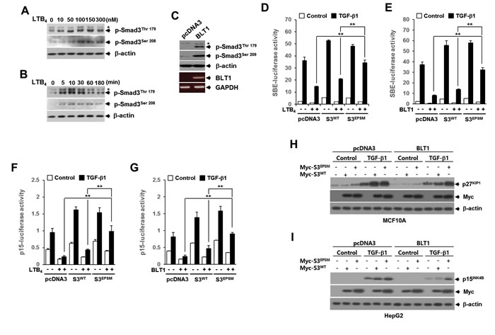 Figure 3: The LTB4/BLT1 axis inhibits TGF-β1-induced Smad3 transactivation and cell cycle arrest through increasing Smad3 linker region phosphorylation. MCF10A cells were incubated A. with the indicated concentrations of LTB4 for 30 min, or B. with 100 nM of LTB4 for the indicated times. The cell lysates were analyzed by immunoblot with specific phosphopeptide antibodies against the phosphorylated Thr179 and Ser208 in the Smad3 linker region. C. Whole cell lysates from stable Mv1Lu-pcDNA3 and Mv1Lu-BLT1 cell lines were analyzed by immunoblot as in A.. Asterisk represents a phospho-Smad2 (Thr220). The BLT1 mRNA level was analyzed by semiquantitative RT-PCR. β-actin and GAPDH levels were monitored as controls. HepG2 cells were co-transfected with D. SBE-luciferase reporter plasmid or F. p15INK4B-luciferase reporter plasmid together with pcDNA3, Smad3WT, or Smad3EPSM plasmid. At 24 h after transfection, cells were treated with EtOH (vehicle) or 100 nM of LTB4 for 30 min, and then stimulated with 5 ng/ml of TGF-β1 for 24 h. E. and G. Cells were transfected and then stimulated with TGF-β1 as in D. and F. excepting co-transfection with BLT1 plasmid instead of LTB4 treatment. All quantitative data are shown as the mean ± SD of three independent experiments. **p < 0.01. Luciferase activities were normalized on the basis of β-galactosidase expression to adjust for variation in transfection efficiency. H. Stable MCF10A-pcDNA3 or MCF10A-BLT1 cell lines infected with mock, Myc-Smad3EPSM or Myc-Smad3WT lentiviruses were stimulated with 5 ng/ml of TGF-β1 for 24 h. I. Stable Mv1Lu-pcDNA3 and Mv1Lu-BLT1 cell lines infected with mock, Myc-Smad3EPSM or Myc-Smad3WT lentiviruses were stimulated with 5 ng/ml of TGF-β1 for 24 h. The cell lysates were analyzed by immunoblot with a specific antibody against p27KIP1, p15INK4B, and Myc, respectively. β-actin levels were monitored as a control.