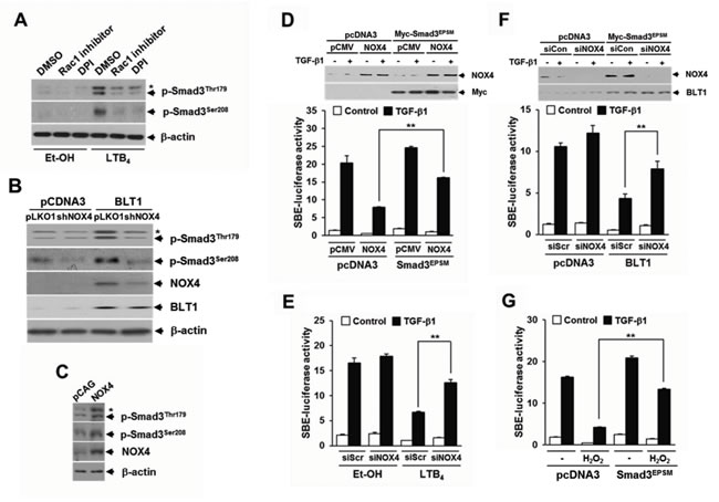 Figure 4: NOX is required for LTB4/BLT1-mediated induction of Smad3 linker region phosphorylation and inhibition of TGF-β1-stimulated SBE-Luc reporter activity. A. MCF10A cells were pretreated with DMSO, 5 µM of Rac1 inhibitor, or 2.5 µM of DPI for 30 min, and then stimulated with EtOH (vehicle) or 100 nM of LTB4 for 30 min. B. Stable HepG2-pcDNA3 and HepG2-BLT1 cell lines were infected with pLOK1 vector or shNOX4 lentiviruses. C. MCF10A cells were infected with mock or NOX4 lentiviruse. Whole cell extracts were analyzed by immunoblot with a specific antibody against NOX4, phospho-Smad3 (Thr179), and phospho-Smad3 (Ser208), respectively. β-actin levels were monitored as a control. Asterisk represents a phospho-Smad2 (Thr220). D. HepG2 cells co-transfected with SBE-luciferase reporter plasmid together with control (scrambled, Scr) or NOX4 siRNAs were treated with EtOH (vehicle) or 100 nM of LTB4 for 30 min and then stimulated with 5 ng/ml of TGF-β1 for 24 h. Upper panel show the immunoblotting result of plasmid transfection. Lower panel show the measured luciferase activity. E. HepG2 cells were co-transfected with SBE-luciferase reporter plasmid and either pcDNA3 or BLT1 plasmid together with control (scrambled, Scr) or NOX4 siRNAs and then stimulated with 5 ng/ml of TGF-β1 for 24 h. F. HepG2 cells co-transfected with SBE-luciferase reporter plasmid and either pcDNA3 or Smad3EPSM plasmid together with pCMV or NOX4 plasmid and then stimulated with 5 ng/ml of TGF-β1 for 24 h. Upper panel show the immunoblotting result of siRNA and plasmid transfection. Lower panel show the measured luciferase activity. G. HepG2 cells co-transfected with SBE-luciferase reporter plasmid together with pcDNA3 or Smad3EPSMplasmid were incubated with or without 100 µM of H2O2 for 30 min and then stimulated with 5 ng/ml of TGF-β1 for 24 h. Luciferase activities were normalized on the basis of β-galactosidase expression to adjust for variation in transfection efficiency. All quantitative data are shown as the mean ± SD of three independent experiments. **p < 0.01.