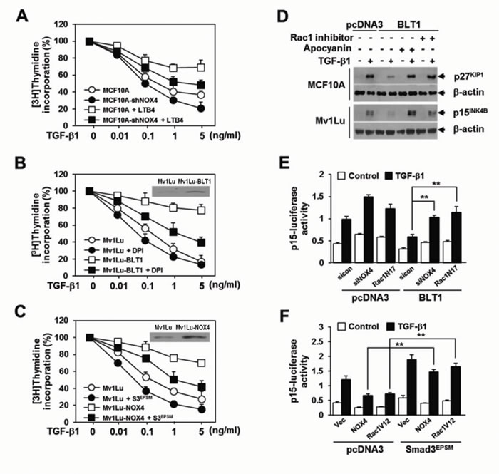 We next investigated whether NOX4 is necessary for the suppression of TGF-β1-induced growth inhibition by LTB4/BLT1 signaling axis. Results showed that in MCF10A and Mv1Lu cells, inhibition by LTB4 treatment (Figure 5A) or BLT1 overexpression (Figure 5B) of TGF-β1-induced suppression of [3H]thymidine incorporation was significantly attenuated by targeted depletion of NOX4 (Figure 5A) or treatment with DPI (Figure 5B). In addition, ectopic expression of NOX4 in Mv1Lu cells strongly inhibited the antiproliferative effect of TGF-β1 on [3H]thymidine incorporation, but the inhibition was significantly abolished by co-expression of Smad3EPSM (Figure 5C). Immunoblot analysis revealed that the BLT1-mediated suppression of TGF-β1-induced p15INK4B and p27KIP1 expression was completely rescued by Rac1 inhibitor as well as by apocyanin, a specific inhibitor of NOX (Figure 5D). RNAi-mediated depletion of NOX4 or ectopic expression of Rac1N17, a dominant negative form of Rac1, also greatly diminished the inhibitory effect of BLT1 on TGF-β1-induced p15INK4B-Luc reporter gene expression (Figure 5E). In contrast, ectopic expression of NOX4 or Rac1V12, a constitutively active form of Rac1, effectively suppressed the reporter gene activity, but the suppression was markedly rescued by Smad3EPSM (Figure 5F). Collectively, these results strongly suggest that NOX plays a pivotal role in the negative regulation of TGF-β1-induced growth inhibition by LTB4/BLT1 signaling axis.