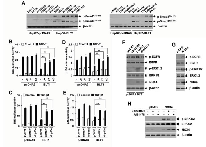 Figure 6: BLT1-NOX-ROS-EGFR-PI3K-ERK1/2-linked cascade constitutes a key LTB4 signaling pathway leading to Smad3 linker region phosphorylation. A. Stable HepG2-pcDNA3 and HepG2-BLT1 cell lines were incubated with DMSO, 5 µM of U0126, 15 µM of SP600125, 15 µM of SB203580, 10 µM of BI-D1870, 10 µM of BIX-02189, 5 µM of AG1478, 20 µM of LY294002, 50 ng/ml of Calphostic C, or 20 µM of KN-92 for 12 h and subjected to immunoblot analysis with specific phosphopeptide antibodies against the phosphorylated Thr179 and Ser208 in the Smad3 linker region. Asterisk represents a phosphor-Smad2 (Thr220). HepG2 cells co-transfected with SBE-luciferase reporter plasmid B. or p15INK4B-luciferase reporter plasmid D. together with pcDNA3 or BLT1 plasmid were treated with DMSO, 5 µM of U0126 (U0), 20 µM of LY294002 (LY), or 5µM of AG1478 (AG) for 30 min and then stimulated with 5 ng/ml of TGF-β1 for 24 h. HepG2 cells were co-transfected with SBE-luciferase reporter plasmid C. or p15INK4B-luciferase reporter plasmid E. and either pcDNA3 or BLT1 plasmid together with pCMV5 or dominant negative (dn) forms of MEK1 (dnMEK1) or p85α (dnp85α) and then stimulated with 5 ng/ml of TGF-β1 for 24 h. Luciferase activities were normalized on the basis of β-galactosidase expression to adjust for variation in transfection efficiency. All quantitative data are shown as the mean ± SD of three independent experiments. **p < 0.01. F. Stable HepG2-pcDNA3 and HepG2-BLT1 cell lines were infected for 36 h with pLKO1 (control) or shNOX4 lentivirus. G. HepG2 cells were infected for 36 h with pCAG (control) or NOX4 lentivirus. H. MCF10A cells infected with pCAG (control) or NOX4 lentiviruse were treated with DMSO, 20 µM of LY294002 or 5 µM of AG1478 for 12 h. Whole cell lysates were analyzed by immunoblot with a specific antibody against EGFR, phospho-EGFR, ERK1/2, phospho-ERK1/2, or NOX4, respectively. β-actin levels were monitored as a control.