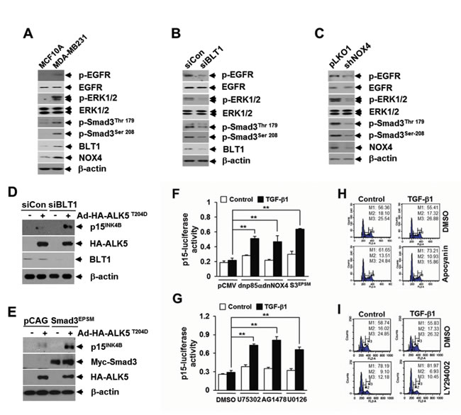 Figure 7: BLT1 signaling to Smad3 linker region phosphorylation contributes to the resistance to TGF-β1 growth inhibition of MDA-MB231 breast cancer cells. A. MCF10A and MDA-MB231 cells, B. MDA-MB231 cells transfected with BLT1 (siBLT1) or control (siCon), and C. MDA-MB231 cells infected with mock or shNOX4 lentiviruses were harvested and subjected to immunoblot analysis using antibodies against phospho-Smad3 (Thr179), phospho-Smad3 (Ser208), ERK1/2, phospho-ERK1/2, EGFR, phospho-EGFR, NOX4 and BLT1. B-actin levels were monitored as a control. Asterisk represents a phospho-Smad2 (Thr220). The β-actin level was monitored as controls. D. MDA-MB231 cells transfected with control siRNA or BLT1 siRNA were infected with mock or HA-ALK5T204D adenoviruses and subjected to immunoblot analysis using antibodies against BLT1, p15INK4B and HA. E. MDA-MB231 cells were co-infected with mock or Smad3EPSM lentiviruses together with ALK5T204D adenoviruses and subjected to immunoblot analysis using antibodies against p15INK4B, Myc, HA, and β-actin levels were monitored as controls. F. MDA-MB231 cells were co-transfected with p15INK4B-luciferase reporter plasmid together with pCMV5, dominant negative (dn) forms of p85α (dnp85α) or NOX4 (dnNOX4), or Smad3EPSM and then stimulated with 5 ng/ml of TGF-β1 for 24 h. G. MDA-MB231 cells transfected with p15INK4B-luciferase reporter plasmid were treated with DMSO, 10 µM of U75302, 5 µM of AG1478, or 5 µM of U0126 for 30 min and then stimulated with 5 ng/ml of TGF-β1 for 24 h. Luciferase activities were normalized on the basis of β-galactosidase expression to adjust for variation in transfection efficiency. All quantitative data are shown as the mean ± SD of three independent experiments. **p < 0.01. MDA-MB231 cells pretreated with 20 µM of apocyanin H. or 20 µM of LY294002 I. were incubated with 5 ng/ml of TGF-β1 for 24 h in the absence or presence of 100 nM of LTB4. Cells were then stained with propodium iodide and subjected to FACS analysis. The percentage of cells in G1 was designated as M1, S as M2, and G2/M as M3.