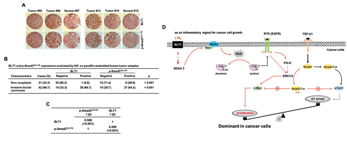 Figure 9: pSmad3L and BLT1 are positively correlated in human breast tumor tissues. A. Expression levels of pSmad3L and BLT1 in normal adjacent tissues and breast tumors were examined using an immunohistochemical staining assay of breast cancer patient samples. B. Statistical analysis of the correlation between the protein levels of BLT1 and pSmad3L in the breast cancer tissue array. C. The expression correlation between BLT1 and p-Smad3Thr179 in the human breast cancer tissues was significant as determined by Kendall tau rank correlation test. r: Kendall correlation coefficient. D. A model illustrating the mechanism underlying promotion of cancer cell proliferation by proinflammatory LTB4/BLT1 signal. In cancer cells, LTB4-evoked BLT1 activation induces production of ROS by increasing NOX4 association with membrane, resulting in activation of EGFR through protein tyrosine phosphatase (PTP) oxidation. The activated receptor induces the phosphorylation of Smad3 in the linker region through a EGFR-PI3K-ERK1/2- and EGFR-ERK1/2-linked signaling pathways, which leads to blockade of suppression of c-myc expression as well as induction of cyclin-dependent kinase inhibitors (p15INK4B and p27KIP1) in TGF-β signaling necessary for growth inhibition. The proposed mechanism suggests that the proinflammatory LTB4/BLT1 signal contributes to promotion of cancer cell proliferation by tipping growth balance to cell cycle progression through inhibition of cytostatic TGF-β1 signaling.