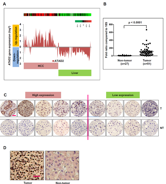 Figure 1: ATAD2 is over-expressed in human HCC samples. A. ATAD2 transcript is up-regulated in HCC tumors compared to matched non-tumor livers in 75 HCC patients in Cohort 1. B. Real-time qPCR measurement of ATAD2 transcript confirmed its significant over-expression in HCC tumors compared to matched non-tumor livers in Cohort 1. (***p < 0.0001) C. Immunohistochemical staining of ATAD2 protein in 9 pairs of HCC tumor (T) and matched non-tumor (NT) livers from patients in Cohort 1. (200X magnification; scale bar: 50 µm). Low expression: positive cells present in < 50% of the entire area; High expression: positive cells present in > 50% of the entire area. D. Representative immunohistochemical images of ATAD2 protein expression in 82 cases of HCC patients in Cohort 2, represented on tissue array (200X magnification; scale bar: 50 µm).