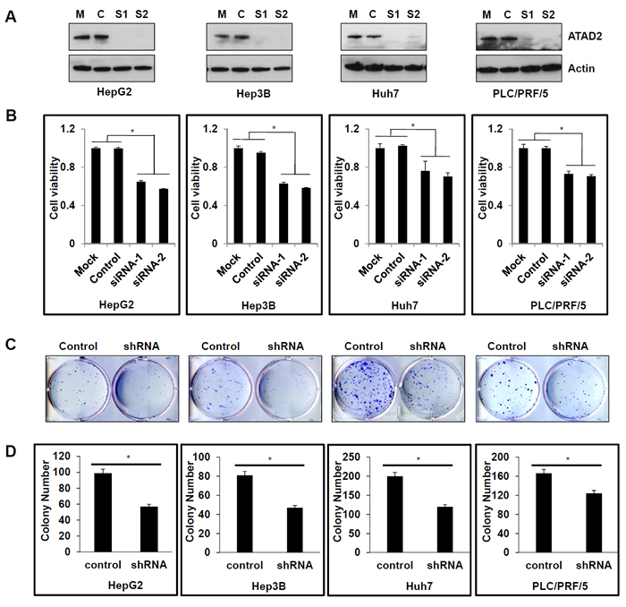 Figure 2: Suppression of ATAD2 inhibited HCC cell viability and colony formation. A. Western blot detection of ATAD2 protein in HCC cells that are mock (M) transfected with transfection reagent only; Control (C)-transfected with control siRNA, or transfected with ATAD2-siRNA1 (S1) or ATAD2-siRNA2 (S2). Actin was used as the internal loading control. B. ATAD2 suppression in HCC cell lines decreased cell viability compared to mock or control siRNA cells (*p < 0.05). C. HCC cells stably expressing ATAD2 shRNA showed decreased colony formation ability compared to control cells. D. Quantification of colony formation in HCC cells stably expressing ATAD2 shRNA. Triplicate independent experiments were performed; *p < 0.05.