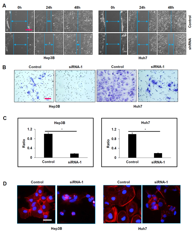 Figure 3: Suppression of ATAD2 impaired HCC cell mobility and invasion. A. In wound healing assay, both Hep3B and Huh7 cells that stably express ATAD2 shRNA migrated slower and were able to close the wound slower than control cells (100X magnification; scale bar: 250 µm). B. In matrigel invasion assay, the number of invaded cells was significantly increased in HCC cells transfected with ATAD2 siRNA-1 compared to control cells (200X magnification; scale bars: 50 µm). C. Quantification of cells that invaded through the matrigel-coated membrane (200X magnification; scale bars: 10 µm). (*p < 0.05) D. HCC cells transfected with ATAD2 siRNA-1 demonstrate disrupted stress fiber network. Stress fiber (polymerized actin) was identified by phalloidin staining (red) in Hep3B and Huh7 cells (200X magnification; scale bar: 50 µm).