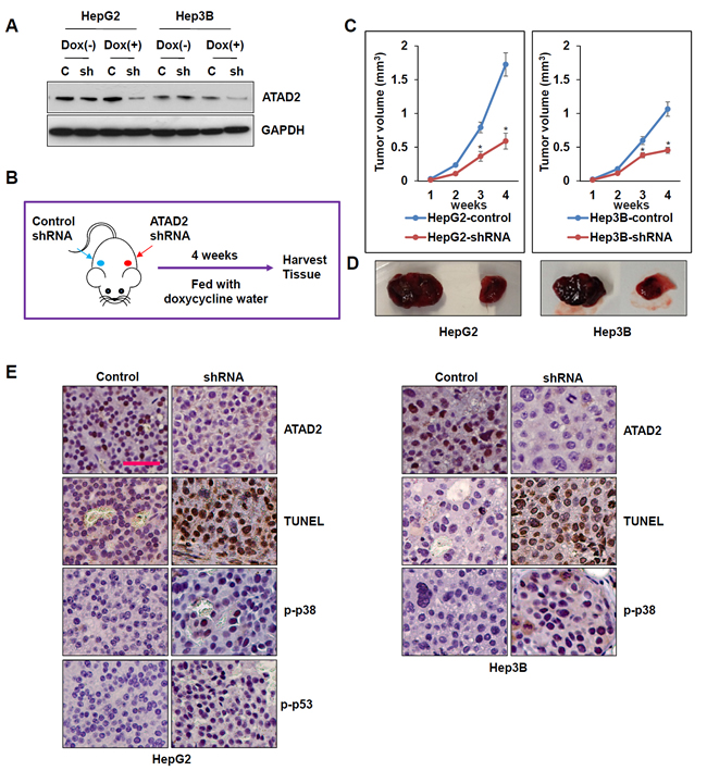 Figure 6: Suppression of ATAD2 impaired growth of HepG2 and Hep3B subcutaneous xenografts. A. ATAD2 expression in HepG2 and Hep3B cells stably expressing ATAD2 shRNA was detected by Western blotting. GAPDH was used as an internal loading control. B. Schematic model of in vivo experiment. C. Growth curves showing the effect of ATAD2 suppression in the growth of HepG2 and Hep3B subcutaneous xenografts (n = 5 in each group). (*p < 0.05). D. Representative images showing harvested tumors derived from HepG2 and Hep3B cells stably expressing control shRNA or ATAD2 shRNA, 4 weeks post-inoculation. E. Immunohistochemical staining of paraffin sections of xenograft tissues showing that ATAD2 suppression was accompanied by increased TUNEL staining, and increased p-p53 and p-p38 levels (200X magnification; scale bar: 50 µm).