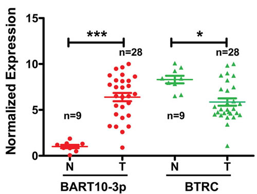 Figure 1: The correlation between the expression of BTRC mRNA and EBV-miR-BART10-3p was analyzed by real-time PCR data obtained from 28 NPC tissues and 9 non-tumor nasopharyngeal epithelial tissues. N, non-tumor nasopharyngeal epitheliums; T, NPC. N, n = 9; T, n = 28, *, p < 0.05; ***, p < 0.001).