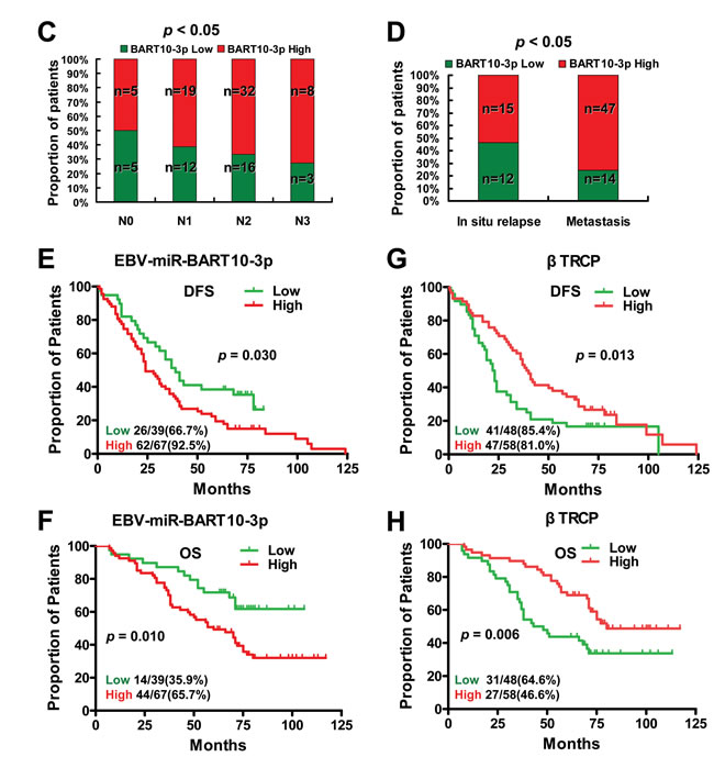Figure 2: The inverse correlation between high expression of EBV-miR-BART10-3p and low expression of βTrCP in NPC and their expression was associated with poor survival of NPC patients. A. Comparison of the expression of EBV-miR-BART10-3p between 106 NPC tissue samples and adjacent epithelial tissues was performed by in situ hybridization (ISH). As shown in representative images, high expression of EBV-miR-BART10-3p was detected in NPC tissues, as compared to adjacent epithelial tissues. B. βTrCP expression was inversely correlated with EBV-miR-BART10-3p in the same cohort of NPC tissues and adjacent epithelial tissues, detected by immunohistochemistry (IHC). C. Overexpression of EBV-miR-BART10-3p in NPC was associated with lymph-vascular invasion (p < 0.05). D. The highly expressed EBV-miR-BART10-3p was correlated with in situ relapse (n = 27) or distant metastasis (n = 61) in NPC patients (p < 0.05). E. and F. The highly expressed EBV-miR-BART10-3p was correlated with shorter disease free survival (DFS, p = 0.030, E) or overall survival (OS, p = 0.010, F) of NPC patients. G. and H. The low expressed βTrCP expression was correlated with shorter disease free survival (DFS, p = 0.013, G) or overall survival (OS, p = 0.006, H) of NPC patients.