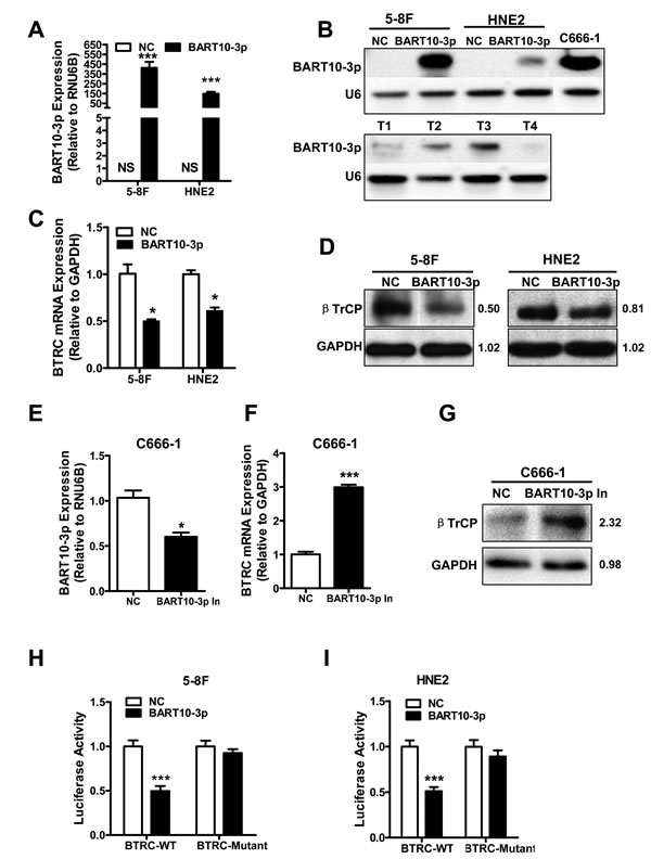 Figure 3: EBV-miR-BART10-3p targeted BTRC gene and inhibited its expression in NPC cells. EBV negative NPC cell lines HNE2 and 5-8F were transfected by EBV-miR-BART10-3p mimics (BART10-3p) or negative control (NC) respectively. Expression of exogenous BART10-3p was detected by real-time PCR A. or Northern blotting B.. NS: no signaling. C666-1 was served as positive control in Northern blotting, T1, T2, T3 and T4 are four NPC primary biopsies, the U6 RNA probe was used as an internal loading control. The expression of BTRC at the mRNA C. or protein D. levels were decreased in the EBV-miR-BART10-3p mimics transfected NPC cells, as compared to one with negative control (NC), detected by real-time PCR or western blotting. E. EBV-miR-BART10-3p expression was significantly inhibited by a synthesized inhibitor (BART10-3p In) in C666-1, a EBV-positive NPC cell line, as compared to negative control (NC) one. The mRNA F. and protein G. expression levels of BTRC were increased in C666-1 cells transfected with EBV-miR-BART10-3p inhibitor. BTRC as a direct target of EBV-miR-BART10-3p was confirmed in HNE2 H. and 5-8F I. cells by co-transfection with EBV-miR-BART10-3p mimics and luciferase reporter containing either wild type (BTRC-WT) or mutated (BTRC-mutant) EBV-miR-BART10-3p binding sites in BTRC 3’-UTR. EBV-miR-BART10-3p mimics attenuated the luciferase activity of BTRC-WT, rather than BTRC-mutant (*, p < 0.05; ***, p < 0.001, Figures are representative of three experiments).