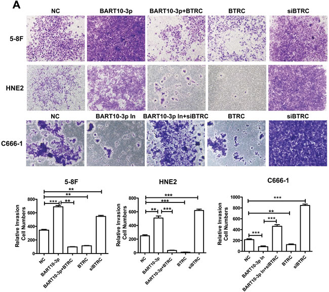 To this end, we investigated the effect of EBV-miR-BART10-3p on BTRC expression in NPC cells. Meanwhile, we examined the correlation of EBV-miR-BART10-3p with BTRC expression and their association with the prognosis of NPC patients. To elucidate the mechanism underlying the function of EBV-miR-BART10-3p in NPC, we also examined the effect of EBV-miR-BART10-3p on invasion and migration of NPC cells and evaluated its potential in regulation of the epithelial-mesenchymal transition (EMT) by regulating EMT-related genes, such as β-catenin and Snail that are downstream substrates of BTRC.