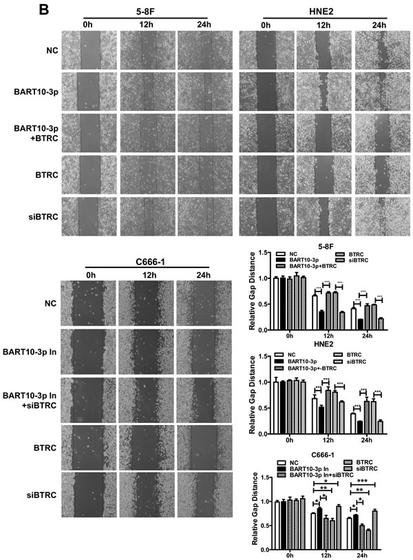 Figure 4: EBV-miR-BART10-3p promoted invasion and migration of NPC cells by reducing BTRC expression. A. The invasion ability was evaluated by transwell assay in EBV negative NPC cells HNE2 and 5-8F or EBV positive cells C666-1. EBV-miR-BART10-3p mimics (BART10-3p), BTRC overexpression vector (BTRC), BART10-3p+BTRC or BTRC siRNA were transfected into HNE2 and 5-8F cells, respectively. EBV-miR-BART10-3p inhibitors (BART10-3p In), BTRC overexpression vector (BTRC), BTRC siRNA (siBTRC), or BART10-3p In+siBTRC were transfected into C666-1 cells, respectively. EBV-miR-BART10-3p mimics could significantly promote invasion of NPC cells, whereas the EBV-miR-BART10-3p mimics-enhanced tumor cell invasion and migration were rescued by overexpression of BTRC. B. Wound healing assay showed that both EBV-miR-BART10-3p mimics and BTRC siRNA accelerated would gap closure, as compared with those with negative control (NC). Overexpression of BTRC in HNE2 and 5-8F cells reduced the migration ability, leading to a delayed wound gap closure. Wound healing assay were also performed after EBV-miR-BART10-3p inhibitors (BART10-3p In), BTRC overexpression vector (BTRC), BTRC siRNA (siBTRC), or BART10-3p In+siBTRC transfection in C666-1 cells. The migration ability could be blocked by BART10-3p In or BTRC expression vector. The BART10-3p In-blocked migration ability of C666-1 cells was rescued by siBTRC, and siBTRC alone also increased the migration ability. The cells in five randomly selected fields were counted and the data were shown as the mean ± SD (*, p < 0.05; **, p < 0.01; ***, p < 0.001).